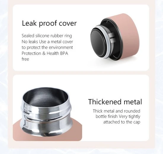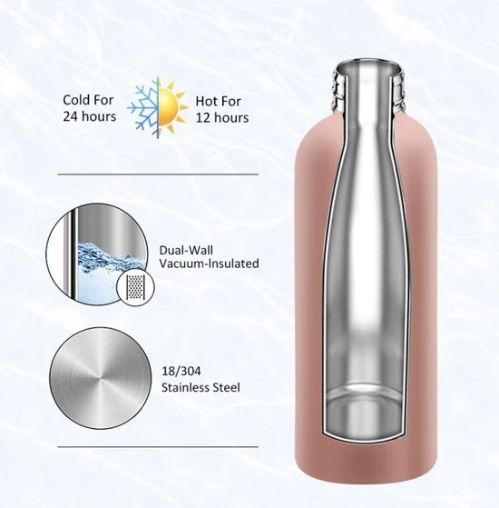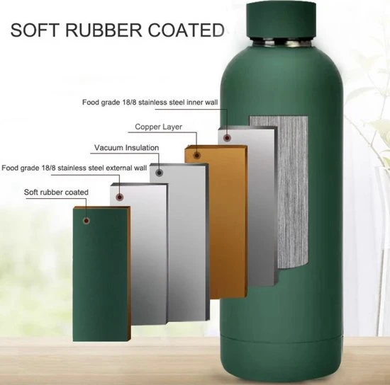 De flessen zijn gemaakt van 18/304 stainless steal met een zachte rubberen coating