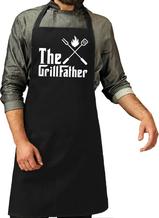 The Grillfather bbq schort voor heren. Op dit zwarte barbecue schort staat de tekst: The Grillfather, met de afbeelding van barbecue accessoires. Dit barbecueschort / keukenschort is leuk om kado te geven aan je vader, bijvoorbeeld voor zijn verjaardag of Vaderdag.
