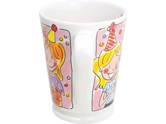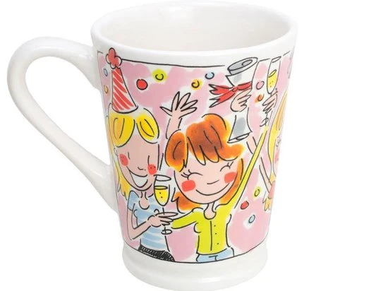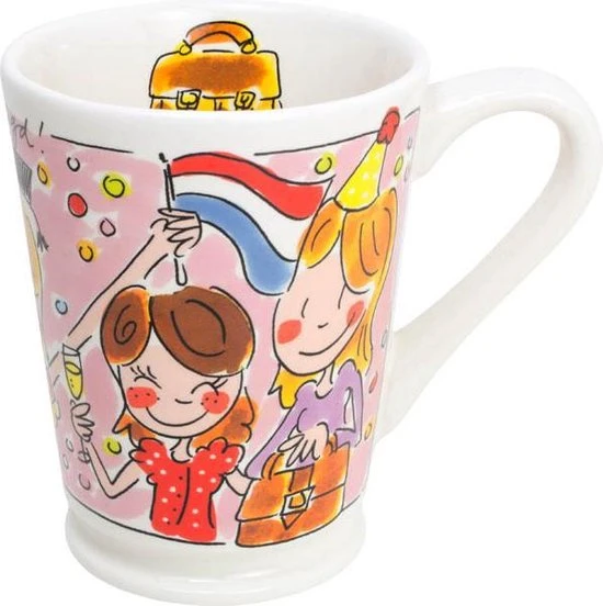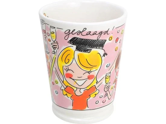 Ben jij op zoek naar een origineel cadeau voor iemand die net geslaagd is? Dan is deze nieuwe kleurrijke Blond Amsterdam mok precies wat je zoekt! Op de roze beker staan verschillende meiden die vieren dat ze geslaagd zijn met een vlag en glas bubbels. Aan de binnenkant van de beker staat een rugzak geïllustreerd.