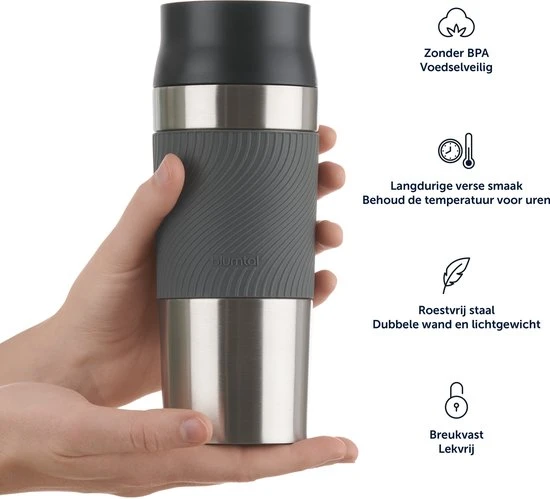 De Classic thermosflessen van Blumtal houden je koffie of thee goed warm – tot maar liefst 6 uur lang! Daarbij is het ideaal om je drankjes urenlang koel mee te houden. Zo geniet je gegarandeerd voor een langere tijd van een vers drankje. De themosbeker is gemaakt van dubbellaags Roestvrij Staal wat geschikt is voor voedselcontact. Het hoogwaardige materiaal zorgt voor een totale isolatie. Daarbij is het BPA- vrij en geschikt voor de vaatwasser.