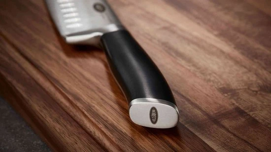 Dit santokumes is geproduceerd van duurzaam roestvrijstaal en is makkelijk in onderhoud. Door het veiligheidsbolster en het ergonomische handvat met endcap geeft het santokumes een professionele ervaring.