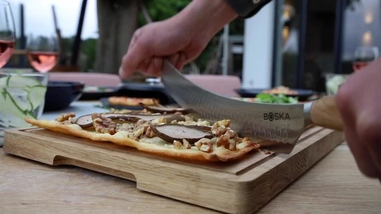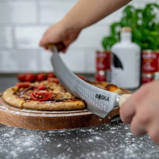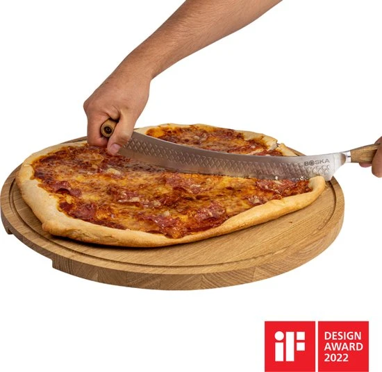 Pizza snijden was nog nooit zo eenvoudig en veilig als met het BOSKA Pizza & Kaasmes Oslo+. Met een wiegende beweging snij je soepel door de hardste pizza en kaaskorsten heen. Het roestvrijstalen mes is licht gebogen mes en non-stick door BSF™. Met twee stevig eikenhouten handvatten.