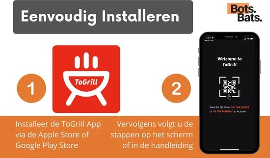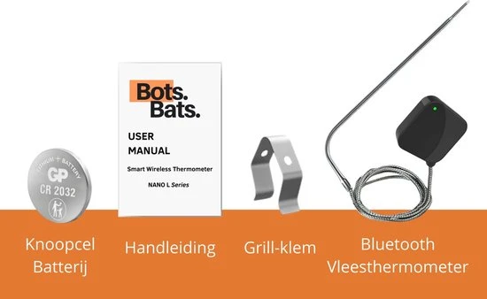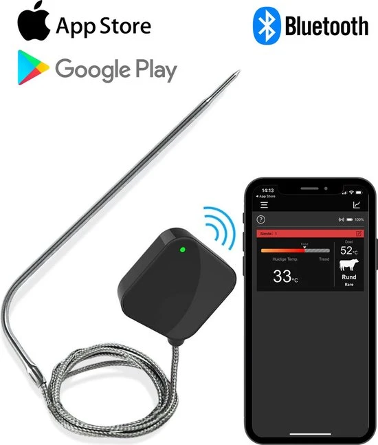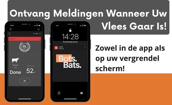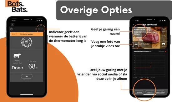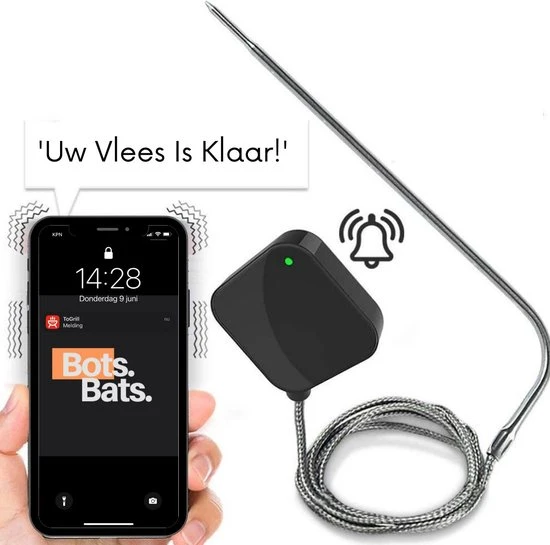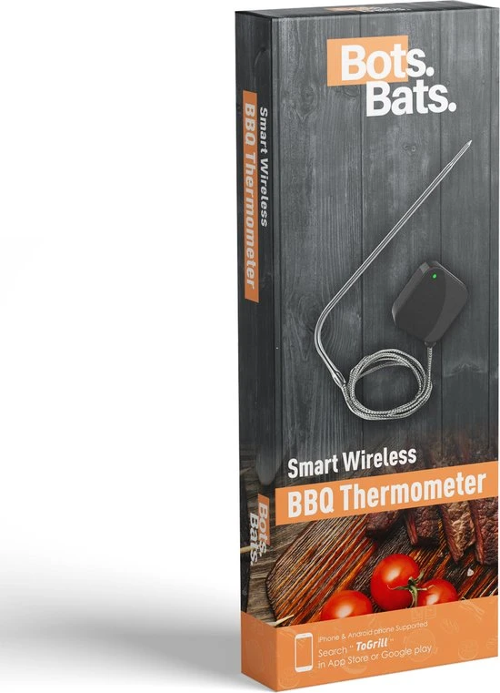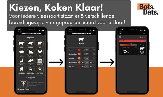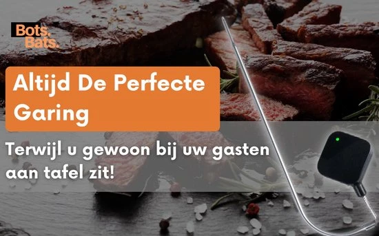 Altijd de perfecte garing realiseren van je vlees tijdens het bakken en braden? Nooit meer de gezelligheid van het feestje missen doordat u achter de BBQ staat? Of gewoon uw gasten imponeren door overheerlijke gerechten op tafel te zetten? Met de digitale vleesthermometer van BotsBats® kunt u op de app via de bluetooth functie de tempratuur van uw vlees gemakkelijk op afstand in de gaten houden op uw smartphone of tablet! De app is na het installeren direct gebruiksklaar met alle soorten vlees, vis en daarbij horende garingswijzen. Ook is de app helemaal in het Nederlands.