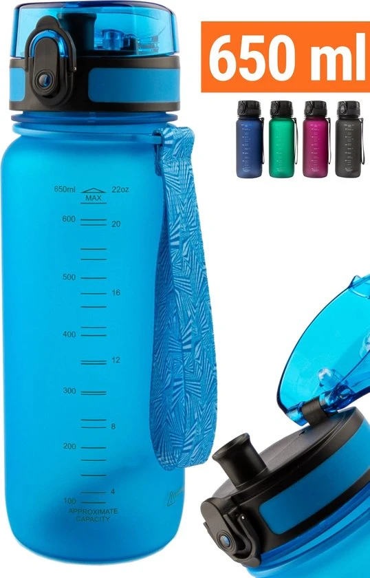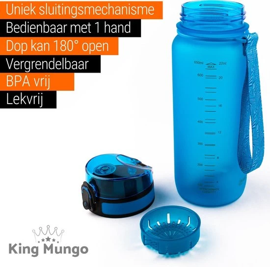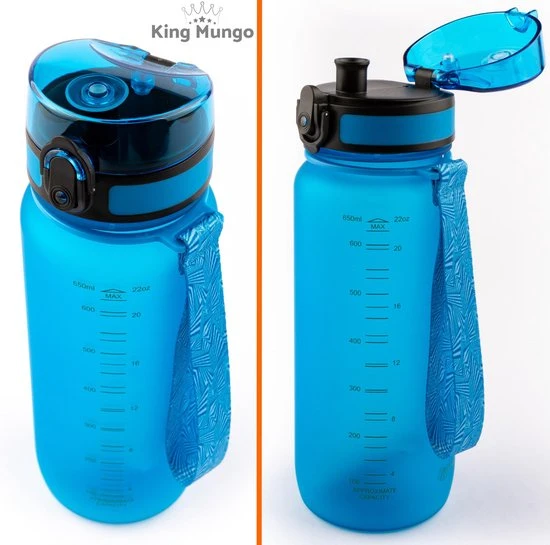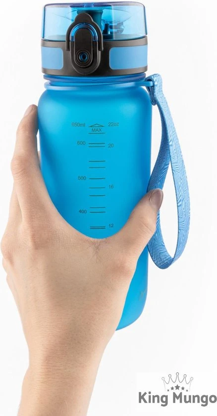 Hoge kwaliteit drinkfles voor volwassenen en kinderen herbruikbaar, zeer comfortabele 650ml waterfles / bidon / drinkbus voor dagelijks gebruik of als sportfles kleur (licht)blauw, fles is met 1 hand te openen en heeft een zeer fijne drinktuit. Deze luxe mat blauwe King Mungo 650 ml design waterflessen zijn BPA vrij (veilig en geen plastic smaak aan het water). Een zeer hoge kwaliteit bidon met unieke lekvrije dop die met 1 hand snel te openen is. Een uniek sluitmechanisme, vergrendel de dop zodat de grote waterfles niet lekt in je tas. Hervulbare 650 ML drinkflessen van King Mungo zijn door iedereen (voor volwassenen en kinderen) en overal te gebruiken, altijd water bij je: tijdens het sporten, op je werk kantoor, op school als drinkbeker, tijdens outdoor activiteiten, backpacken, onderweg in de auto of gewoon thuis. De fles gaat jaren mee en is dus heel duurzaam! Kies een van de diverse kleuren (blauw, groen, zwart, rood/paars) drinkflessen die King Mungo in het assortiment heeft. Hervulbaar, zeer functioneel, grote inhoud, gemaakt van zeer sterk Tritan en de sport drinkflessen bevatten geen BPA. Ook verkrijgbaar in 500ml, 750ml en 1 liter.