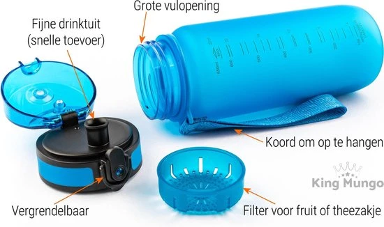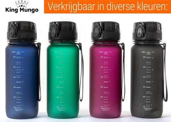 Gemaakt van zeer stevig materiaal “Tritan plastic” dit geeft een hoge kwaliteit en bevat geen schadelijke BPA (en geen plastic smaak aan het water). De draaibare dop sluit de fles keer op keer goed en lek vrij af. Het sluitingsmechanisme is sterk en gaat heel lang mee. Ben je op zoek naar een zeer goede kwaliteit waterfles of sportbidon waarvan je nog lang plezier van kunt hebben? Dan is deze paarse hervulbare drinkbus fles “King Mungo KMDF041 mat blauwe de oplossing, er kan veel water in dus hoe je niet vaak bij te vullen. Deze groot formaat bidon is het de ideale drinkfles voor elke activiteit! De 0,650 liter waterbottle is valbestendig (ten minste 1 meter), hij kan tegen een stootje. Met een grote inhoud van 650 milliliter is deze ideaal als sportfles!