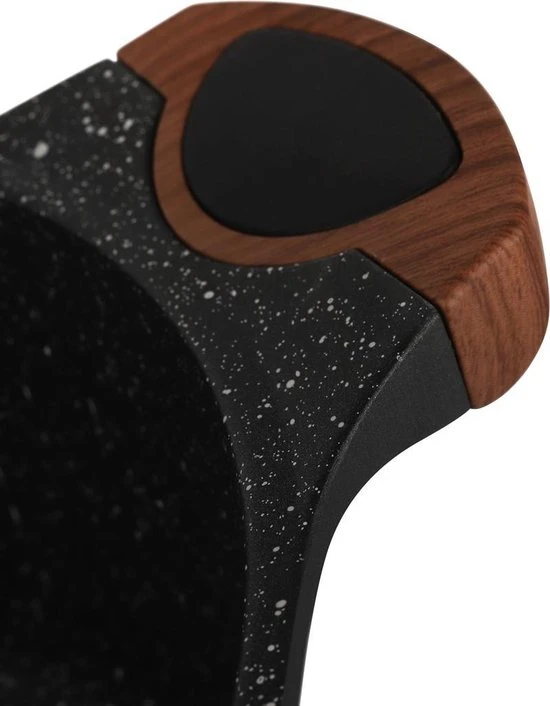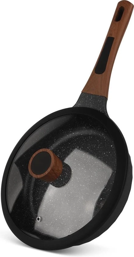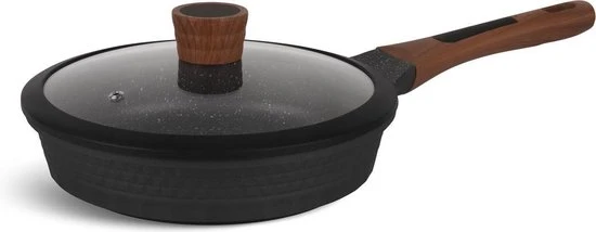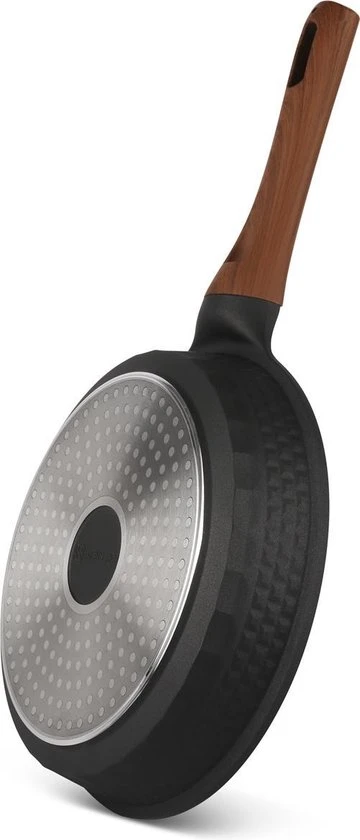 - Gegoten aluminium, met keramische/marmeren coating, ideaal voor aanbraden, en vetarm koken