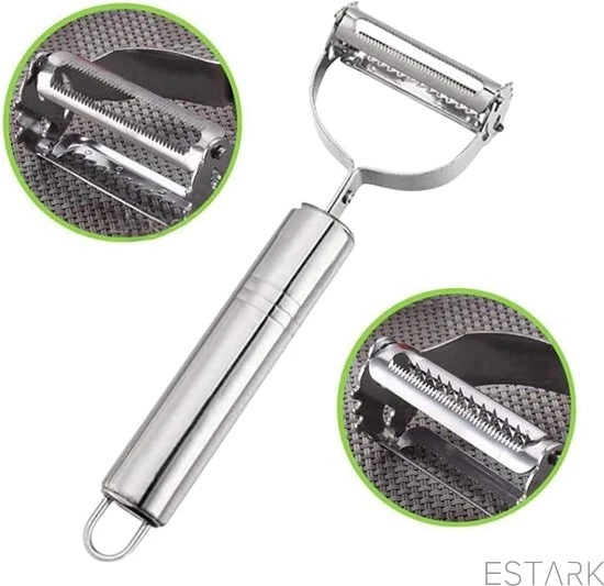 Deze ESTARK ultrascherpe dunschiller met twee messen kan worden gebruikt voor het schillen en julienen van alles, van appels en peren tot wortelen, komkommers, aardappelen, pompoen en courgette, gemakkelijker en efficiënter. Je maakt in korte tijd prachtige maaltijden en daarmee kun je meedoen aan de revolutionaire rage van afvallen.