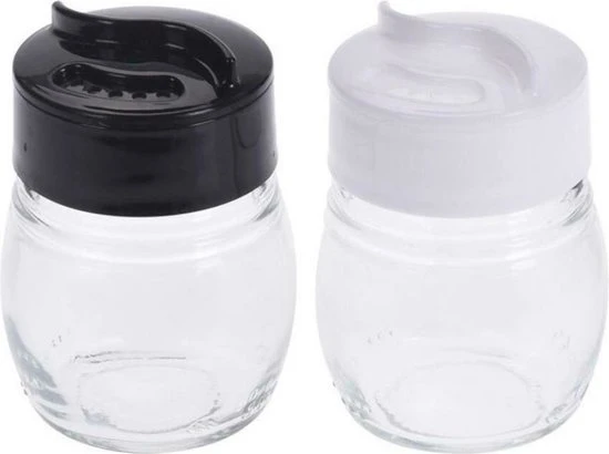 Setje van 2x stuks peper en zout vaatjes. Formaat per potje: 5 x 7 cm. Dit peper/zout stel is gemaakt van glas en is voorzien van een kunststof schroefdopje. Uiteraard kunnen de potjes ook gebruikt worden voor andere fijne kruiden. Tafelvaatjes voor kruiden en specerijen.