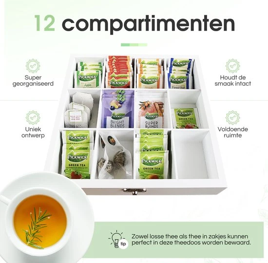 Het moment van de dag waarbij je gezellig samen bijkletst onder het genot van een kopje thee wordt dankzij deze luxe theedoos nog specialer. Zeg nou zelf, wie vindt het nou niet leuk om te kunnen kiezen uit maar liefst 12 unieke theesmaken in een exclusieve theedoos?!