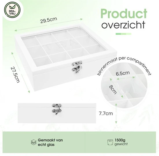 Theekist large – witte theedoos 12 vaks – echt glas – met weerstandsscharnier – niet gevuld