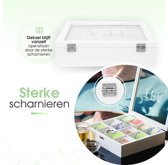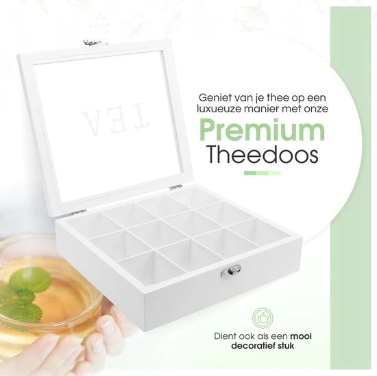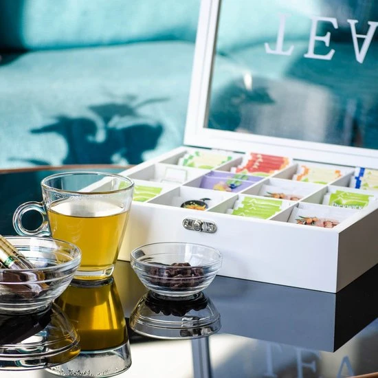 Wanneer je opzoek bent naar een luxe theedoos die jouw interieur automatisch upgrade, dan is de Theedoos wit van Fortecom de ideale keuze. Dankzij de glazen deksel, de wit-matte afwerking, de 12 opbergvakken en de speciale weerstandsscharnieren, kun je jouw gasten vanaf nu met één hand een mooi palet aan theesmaken aanbieden (zonder dat de deksel dichtklapt). Zo heb je nog één hand vrij om als theeliefhebber houdt je hierdoor uitgebreid te vertellen over de herkomst van de thee. Zo biedt je jouw gasten een volledige “tea experience”.