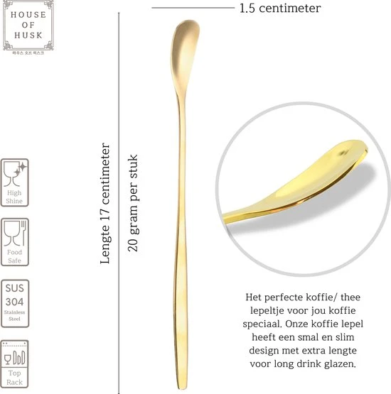 House Of Husk Latte Macchiato Lepels Set – Lange Theelepels – Koffielepels – Longdrinklepels – Barlepel – RVS – 6 Stuks – 17CM – Goud