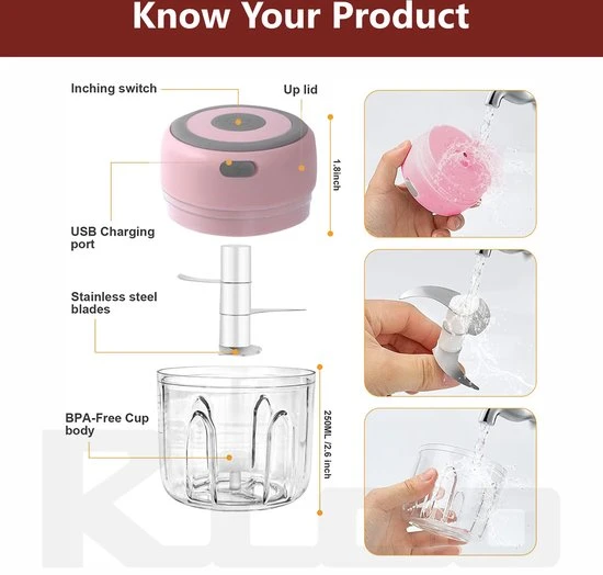 IMTEX Hakmolen electrisch – USB oplaadbal – Mini Portable Chopper – 250ml – Roze