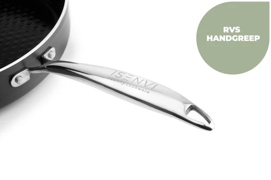 ISENVI pannen zijn 100% PFAS vrij, 100% duurzaam en geschikt voor iedere hittebron, inclusief inductie. De pannen van ISENVI zijn uitgerust met een unieke antiaanbaklaag. Dit zorgt er niet alleen voor dat jouw ingrediënten niet aankoeken, maar ook dat je gezonder kunt koken. Je hebt namelijk een stuk minder olie en/of boter nodig. Mede door de roestvrijstalenhandgreep en door het lichtgewicht, zijn de pannen erg makkelijk te verplaatsen.