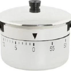 Ronde pannen kookwekker wit ijzer. De kookwekker is per minuut instelbaar en kan tot 60 minuten ingesteld worden. Formaat: ca. 7 cm in diameter en 5 cm in hoogte. Materiaal: ijzer. Keuken kookwekkers.