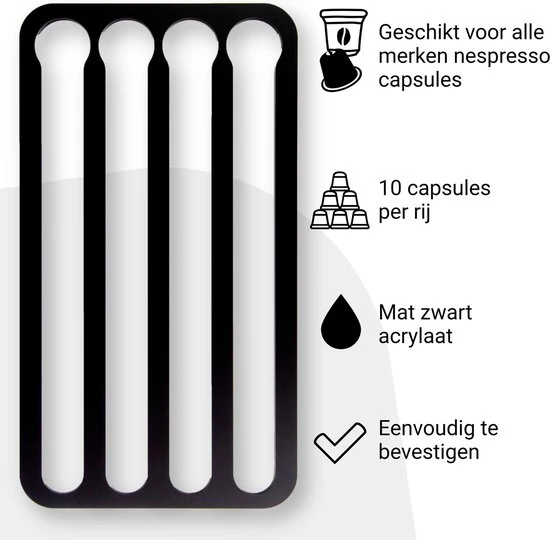 De capsulehouder is gemaakt van mat zwart acrylaat van 3mm dik. Hierdoor heeft de capsulehouder een mooie en luxe uitstraling en contrasteert subtiel met de casules. De afstand houders zijn 3mm hoog zodat de capsules makkelijk in en uit kunnen worden genomen. Daarnaast, een eyecatcher in de keuken!