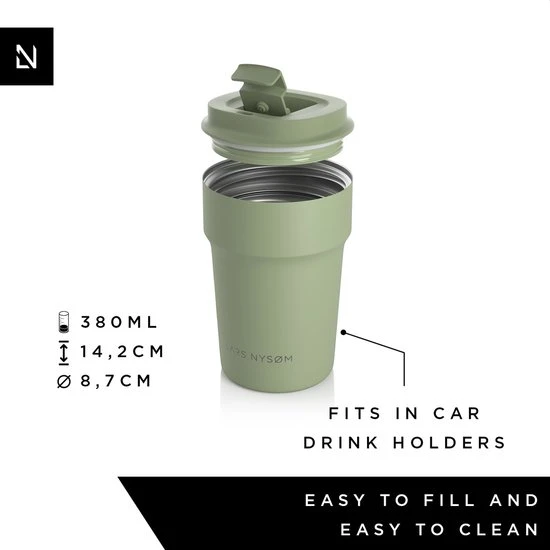 De geïsoleerde mok is ideaal voor uw koffietoevoer. De thermosbeker past in autodrankhouders, is lekvrij en gemakkelijk te vullen. De drinkopening is perfect om afgemeten te drinken zonder te morsen.