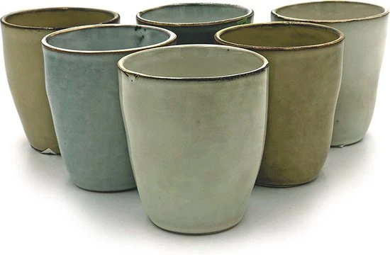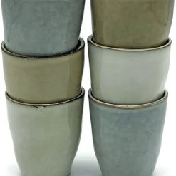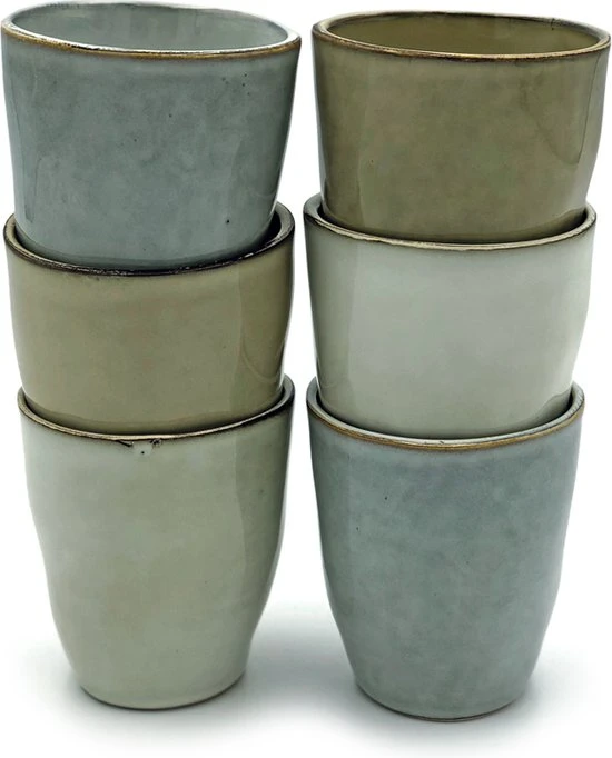 Een set van zes keramische mokken in een palet van beige en grijs tinten. Elke beker heeft ongelijke, ‘free-form’ randen en is afgewerkt met een speciaal glazuur. Door de afwerkingstechniek kunnen variaties in glazuur en kleur ontstaan. Geschikt voor de vaatwasser en magnetron.