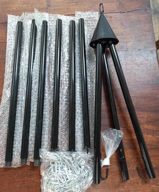 - vier kettingen met haken (1 voor de dutch oven en 3 voor een rooster)