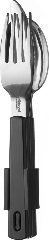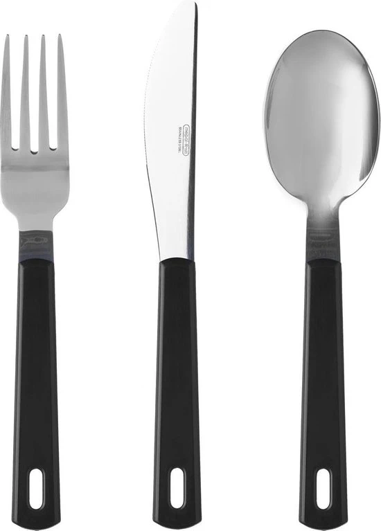 Nooit meer zoeken naar een complete bestekset dankzij deze 3-delige set in zwart. De bestekset wordt bij elkaar gehouden door een praktische clip, waardoor je alle delen eenvoudig bij elkaar houdt. Het rvs bestek bestaat uit een vork, mes en lepel en kan natuurlijk tegen een stootje. Na gebruik mag de set gewoon in de vaatwasser, daar heb je geen omkijken meer naar! Deze set is ook handig om te gebruiken als campingbestek.