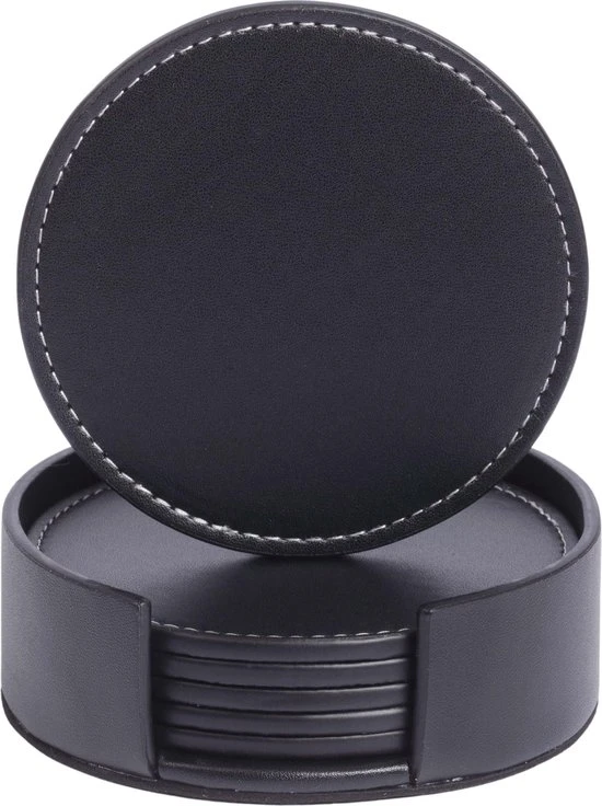 Onderzetters voor glas of mok van leer. Set van 6 stuks in een bijpassende houder. De kleur zwart past in vrijwel elk interieur. Met deze lederen onderzetters bescherm je jouw tafel of bureau tegen kringen en krassen.