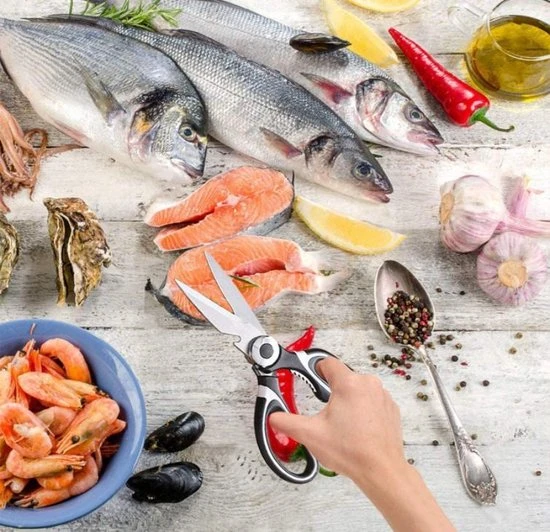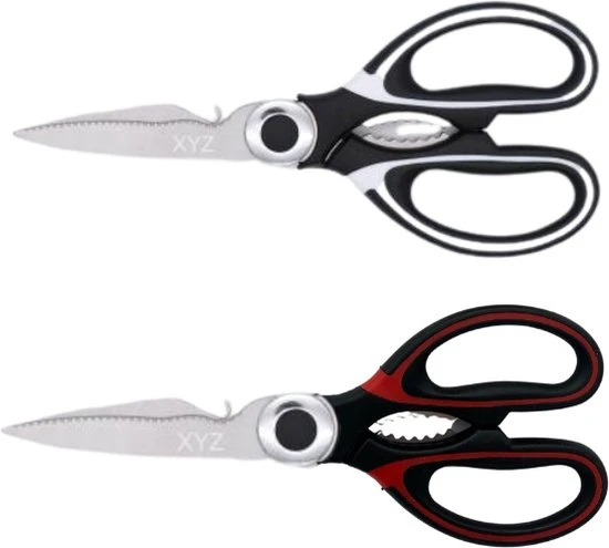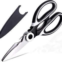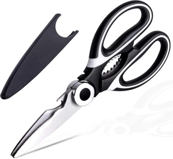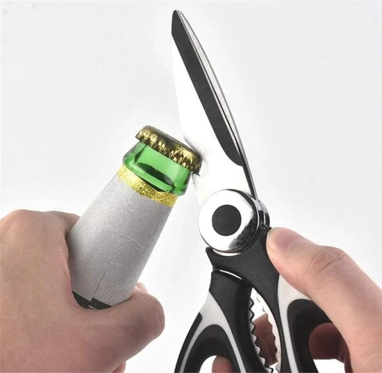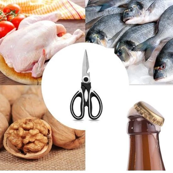 4-in-1 multifunctioneel gereedschap: onze schaar is uitstekend geschikt voor het snijden van groot vlees, botten, ribben, kippenvleugels, gevogelte, zeevruchten, kruiden, groenten en meer. Dankzij het innovatieve gekartelde mesontwerp kunt u ook visschubben verwijderen. Extra stalen tanden tussen de handgrepen kunnen goed afgesloten flessen openen, krabschalen of noten kraken, en het werkt zelfs als een flesopener