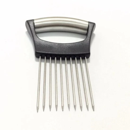 Deze snijhulp is ideaal voor het op maat snijden van gelijke plakken van uien, tomaten en diverse groenten en beschermen je vingers bij het snijden van hete producten zoals heet vlees of aardappelen. Je zet de pennen op het etenswaar was je wilt snijden en je snijd tussen de pennen door.