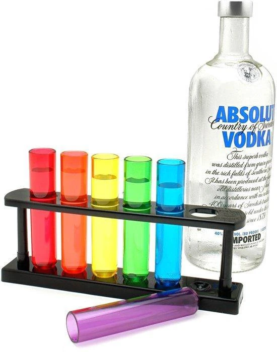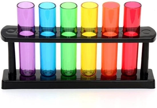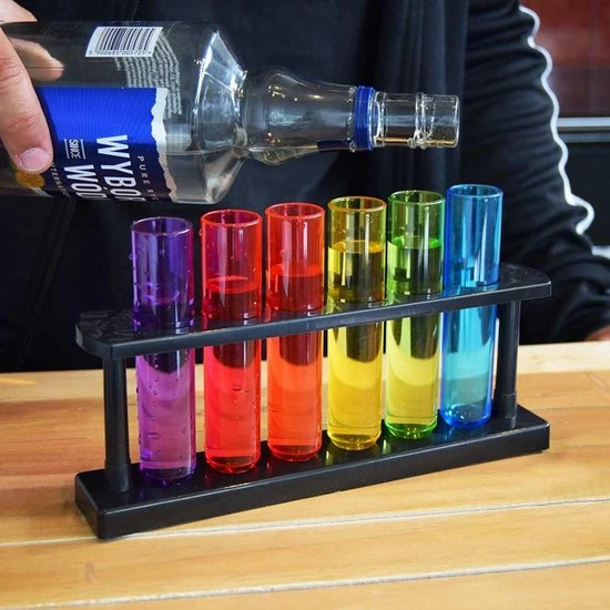 Deze gave Reageerbuis shotjes zijn voor iedereen die houdt van drank. De shotglaasjes staan in een handig rekje en hebben allemaal een andere kleur zodat iedereen weet welk glaasje van hem of haar is.