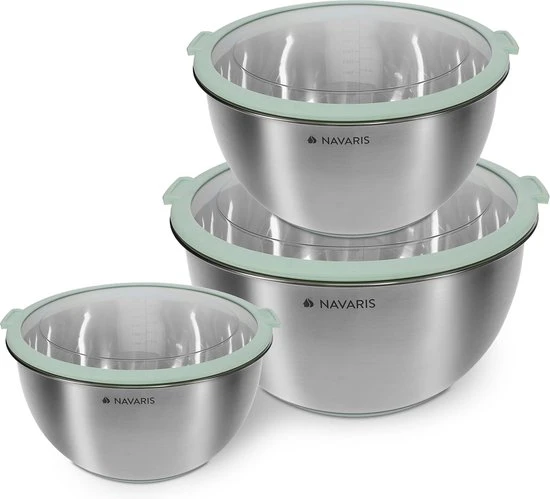 - DETAILS: De bakken zijn gemaakt van hoogwaardig roestvrij staal. Door de praktische antislip siliconen aan de onderkant zijn ze super stabiel en blijven ze stevig op hun plek staan. Ideaal bij het gebruik van een handmixer!