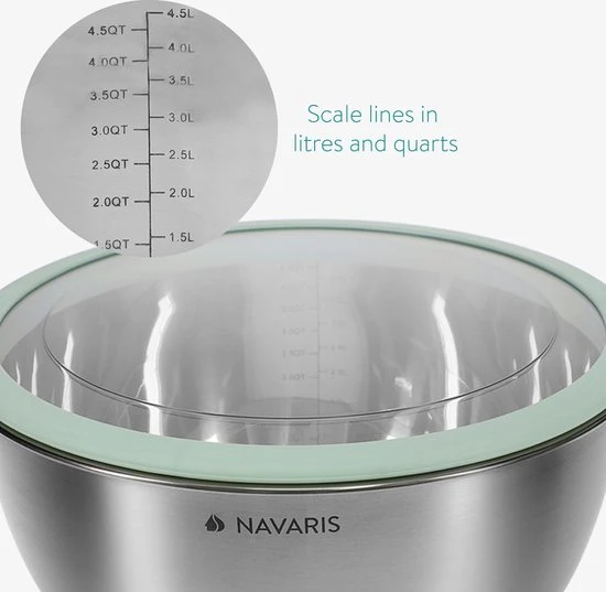 - INCLUSIEF HANDIGE MEETLIJN: In beide schalen zit een meetlijn, die zowel liters (l) als kwarts (qt) aangeeft. Zo is nauwkeurig werken geen enkel probleem.