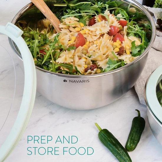 - Met behulp van de hoogwaardige roestvrijstalen kommen kun je eenvoudig ingrediënten mengen, kneden én dankzij de handige deksels ook bewaren.