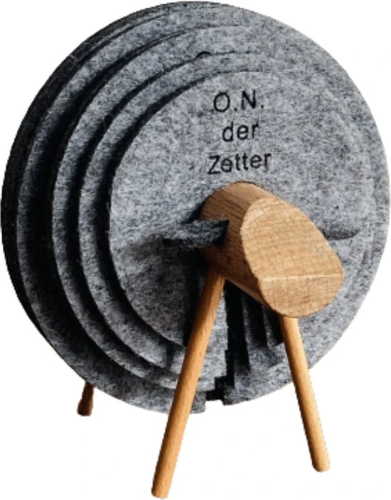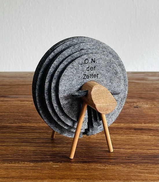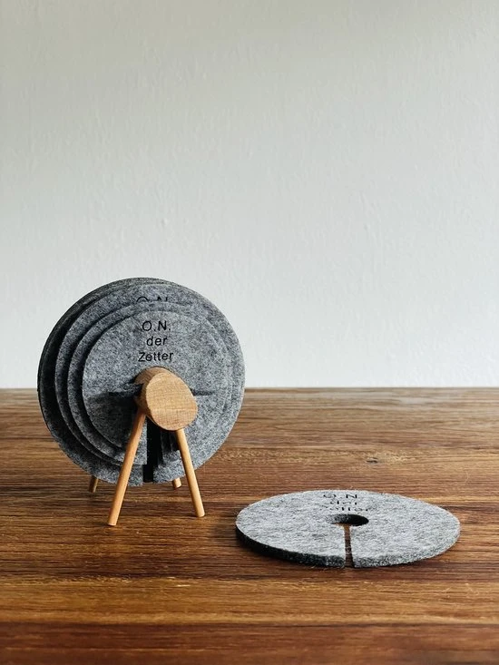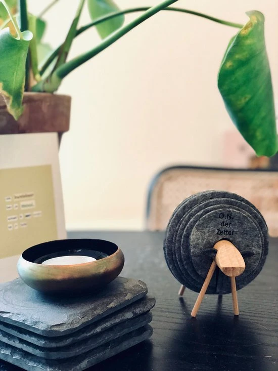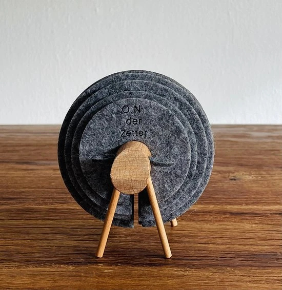 ✅ Houten schaap met 12 stuks ronde vilten donkergrijze onderzetters.