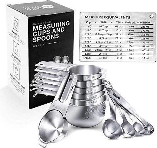 •Volledige uitgebreide set – Onze complete set bestaat uit 7 roestvrijstalen maatbekers (1/4, 1/3, 1/2, 2/3, 3/4, 1 beker) en lepels (1/8, 1/4, 1/2, 1 el, 1/2, 1 el), 2 D-ringen en een magneet met maatequivalenten.