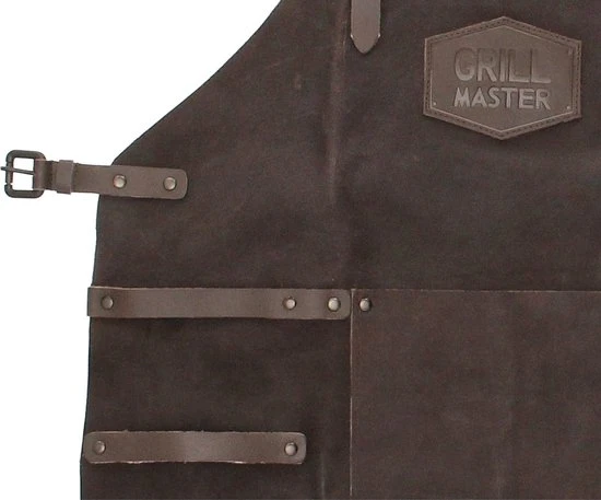 Een stoer schort, gemaakt van echt leer in een grijsbruine kleur met ruwe afwerking en bruine accenten. Met dit leren schort sta je als een echte professional te koken of te barbecueën. Het schort heeft handige verstelbare bandjes die je met gespen vast kan zetten, op de nek is een extra versteviging gemaakt waardoor het leer niet in je nek snijdt.