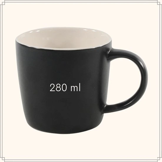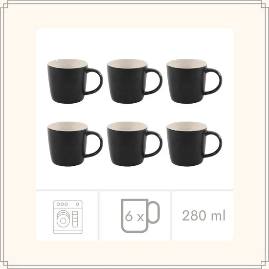 - De kopjes hebben een matzwarte afwerking en crème kleurige binnenkant