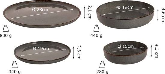 · Product: 4 dinerborden, 4 (ontbijt)borden, 4 diepe borden, 4 schalen