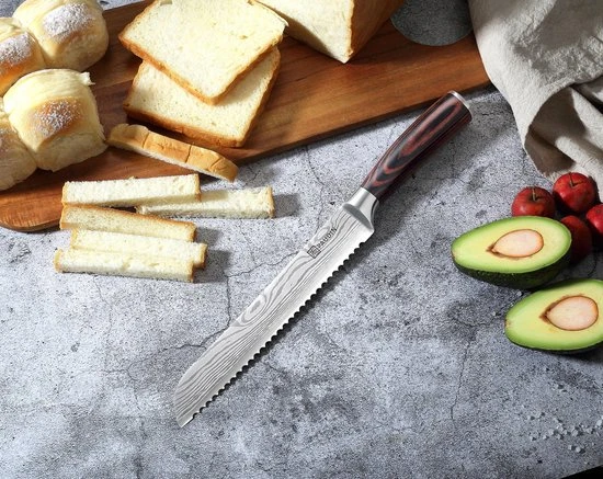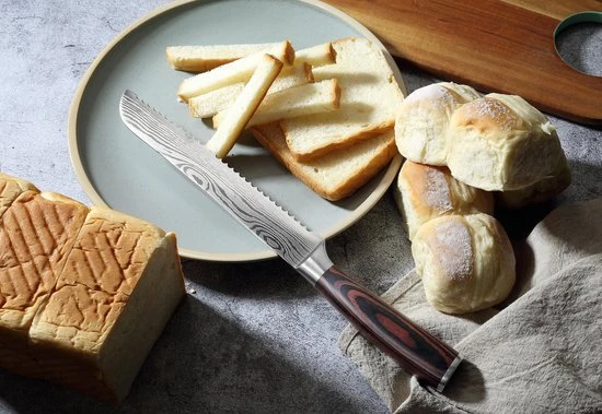 - Hoog kwalitatief broodmes met esthetisch ingelaserd Damascus patroon