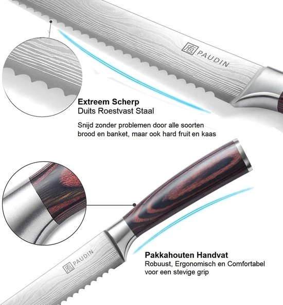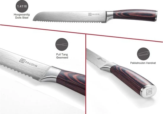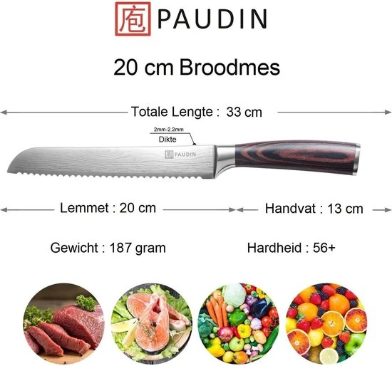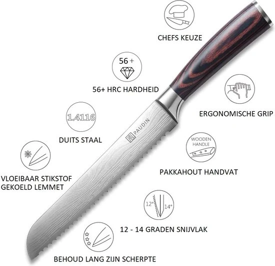 Een goed broodmes koopt u niet voor even, maar moet jaren meegaan en in alle situaties soelaas bieden. Paudin staat voor kwaliteit en duurzaamheid, louter de beste staalsoorten worden gebruikt en de afwerking is altijd van het hoogste niveau. Een PAUDIN mes is vlijmscherp, elegant en heeft een veilige, ergonomische en comfortabele grip. Dit alles zorgt ervoor dat dit broodmes zich binnen zijn segment kan scharen onder de sterkste en beste messen in de markt! Kortom, PAUDIN keukenmessen zijn de messen waar u naar zoekt!
