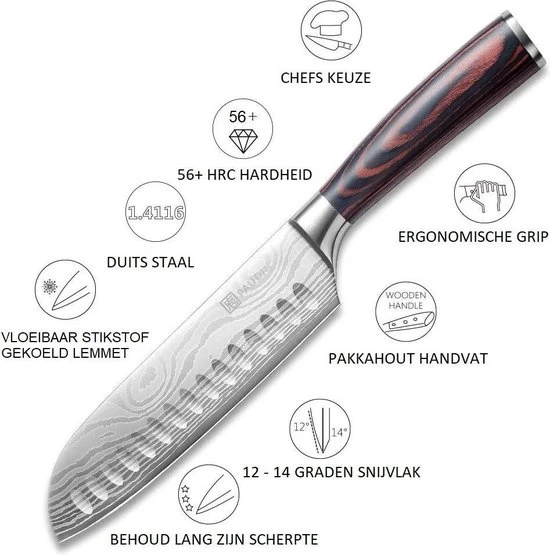 Het Aziatische Santoku mes is vervaardigd uit Duits 1.4116 staal dat buiten een hoog koolstofpercentage ook nog eens molybdeen, vanadium, mangaan, siliconen en chroom bevat. Deze samenstelling zorgt voor uitmuntende treksterkte, hoge hardheid en een goede slijtbestendigheid. Het hoge chroomgehalte van meer dan 15% samen met de de siliconene maakt dat dit mes goed roestvast is.