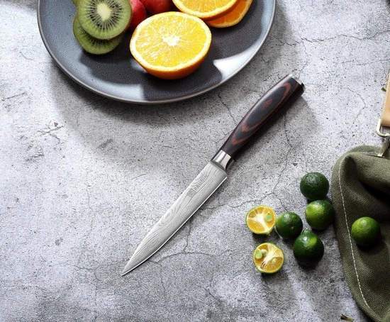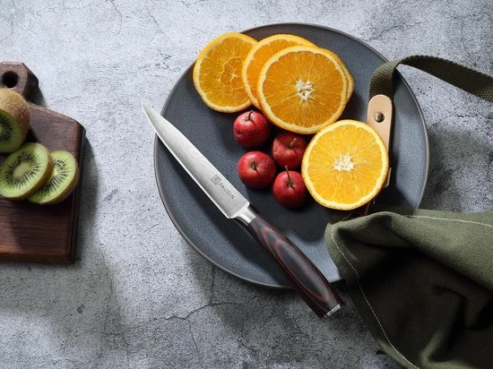 Dit universele mes is goed gebalanceerd en niet te zwaar waardoor dit mes fijn in gebruik is en u niet zo snel een vermoeide pols zal krijgen. Het ergonomisch ontworpen pakkahouten handvat ligt fijn in de handen met een stevige maar ook comfortabele grip. Kortom het ideale keukenmes voor zowel de professional als de hobbykok!