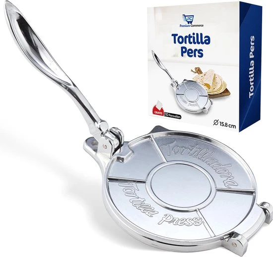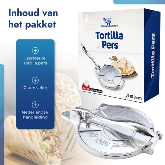 Met de tortilla pers maak jij jouw eigen heerlijke tortilla’s of andere gerechten. De tortilla pers wordt geleverd inclusief 10 persvellen. De persvellen zorgen ervoor dat het deeg niet blijft plakken aan de pers. De tortilla pers van Premium Commerce heeft een doorsnede van 15.8 cm.