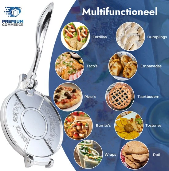 De tortilla pers is gemaakt van hoogwaardige kwaliteit en is voor meerdere gerechten geschikt. Bijvoorbeeld tortilla’s, taco’s, wraps, burrito’s, dumplings, empanadas, tostones, taartbodem en roti! Maak heerlijke verse tortilla’s met de tortilla pers van Premium Commerce!