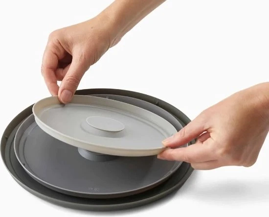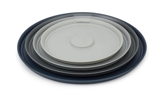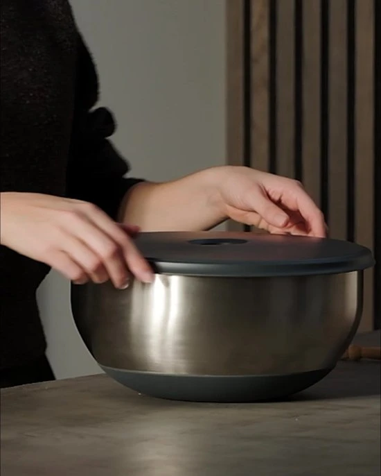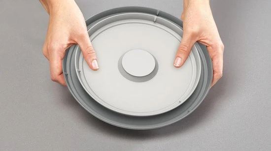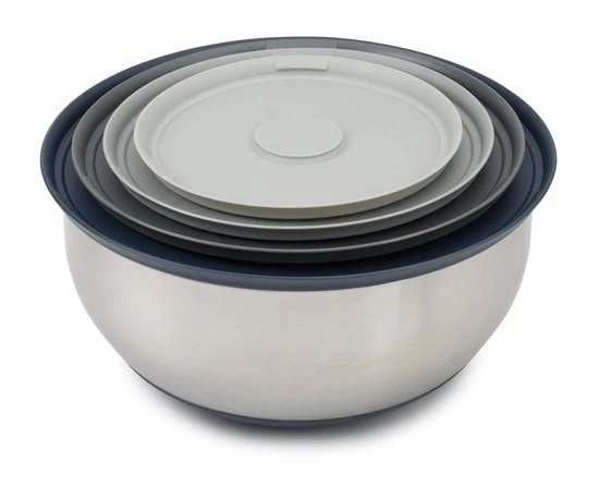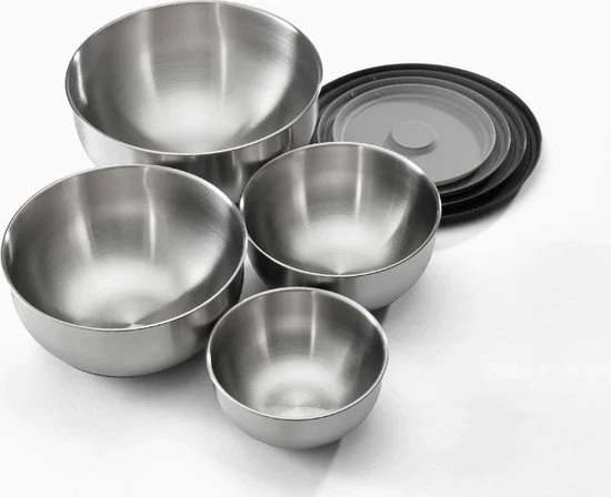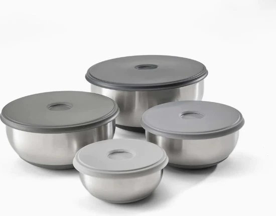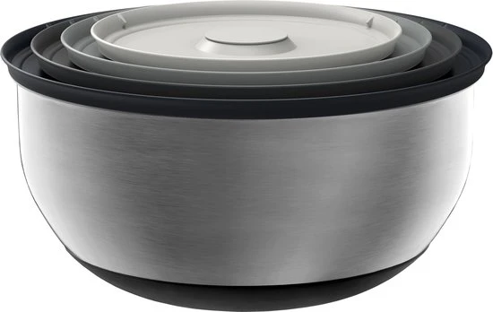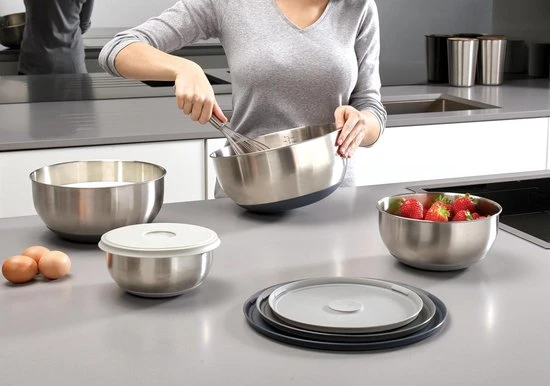 De Nest Prep&Store schalenset met deksels van Joseph Joseph doet precies zoals de naam je al doet vermoeden. Het helpt je bij het bereiden van een grote variatie aan gerechten waarna je ze met de deksels veilig kunt bewaren. De set bestaat uit 4 RVS schalen met ieder een bijpassende kunststof deksel. Het RVS voorkomt vlekken en zorgt ervoor dat geuren niet in de schalen zullen achterblijven. De onderzijde van iedere schaal is uitgerust met een siliconen antislip laag zodat de schalen tijdens het gebruik stevig op het aanrecht blijven staan. Om zoveel mogelijk kastruimte te besparen kunnen de schalen in elkaar bewaard worden en kunnen de deksel in elkaar geklikt worden. Alle onderdelen kunnen na gebruik eenvoudig worden schoongemaakt in de vaatwasser (de deksels alleen in het bovenste rek). Let op met het gebruik van schurende schoonmaakmiddelen en metalen voorwerpen. Deze kunnen krassen achterlaten in het RVS.