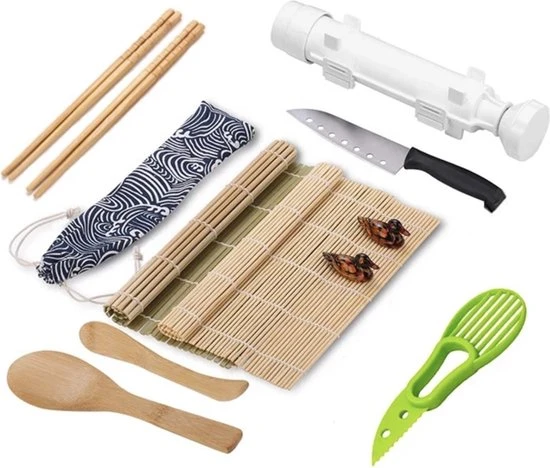 Wil jij zelf als een echte Japanse sushischef de lekkerste sushi kunnen maken, gewoon bij jou thuis? Dan kunnen deze sushitools zeker niet ontbreken! Deze complete 13-delige sushiset bestaat uit 2 bamboematjes, grote en kleine spatels, een 3-in-1 avocadosnijder, een sushi mes, 2 bamboe eetstokjes met opbergtasje, 2 eenden stokjeshouders en een sushibazooka waarmee je gemakkelijk en snel zelf sushi kunt maken. Daarnaast wordt de set ook geleverd met een gratis E-book waarin heerlijke recepten staan!
