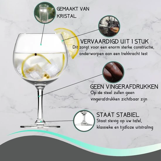 Niets voegt meer toe aan uw lekkerste Gin-Tonic cocktail dan hem in luxe glazen te serveren. Deze kostbare glazen zijn gemaakt van kristal, en bezorgen u een tijdloze en klassieke uitstraling. De glazen zijn elegant en perfect voor dagelijks gebruik. Zelf Gin Tonic maken? Deze set is inclusief 35 cocktailrecepten, waarvan 10 Gin Tonic recepten!