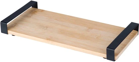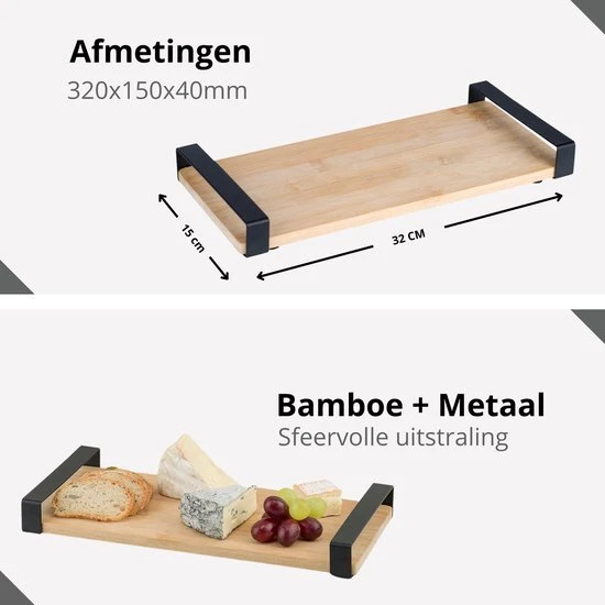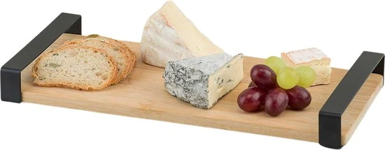 De houten serveerplank is gemaakt van 100% bamboe welke een natuurlijke uitstraling geeft op de tafel. De metalen handgrepen welke zwart gecoat zijn geven deze hapjesplank een industriele look.