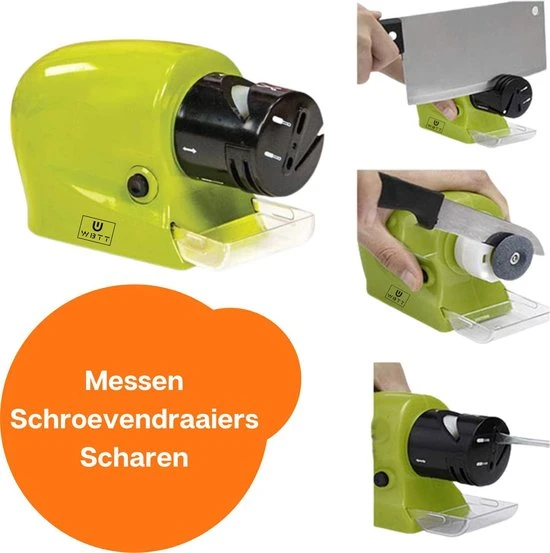 Met deze Elektrische messenslijper van WBTTechnics© zijn botte keukenmessen, scharen en schroevendraaiers verleden tijd. Dankzij de snel roterende slijpsteen hoef je enkel je te slijpen voorwerp in de messenslijper te plaatsen en de messenslijper doet de rest voor je.