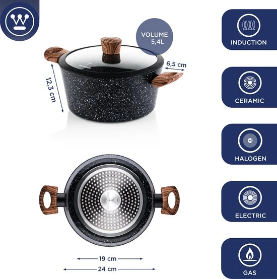 Met de Westinghouse Zwart Marmer Kookpan Speciale Editie 24cm haal je een ideale kookpan in huis om de heerlijkste gerechten te bakken, stoven en braden. De braadpan is voorzien van een duurzame anti-aanbaklaag. Door de snelle opwarming en gelijkmatige warmteverdeling bereid je makkelijk en snel je favoriete gerechten, ook voor een groot gezelschap.