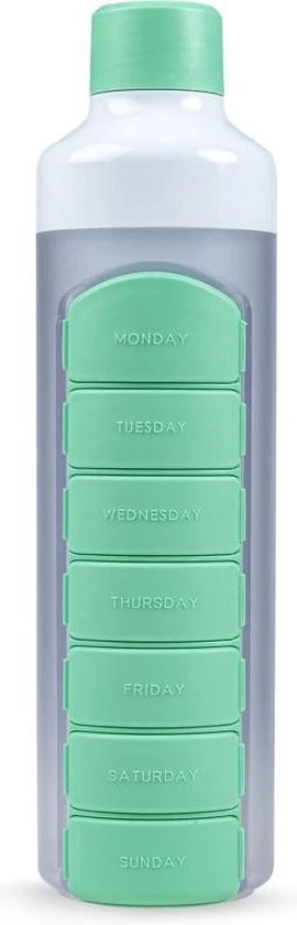 De YOS Bottle groen is een waterfles en pillendoos in één. Zo heb je altijd je pillen bij de hand en het water om ze in te nemen. Geschikt voor 1 of meer pillen per bakje. Zoals medicijnen, voedingssupplementen of sportcapsules.De YOS bottle Weekly is compact uitgevoerd dus gemakkelijk om mee te nemen. Hij is lekvrij en robuust uitgevoerd. Het pillencompartiment met 7 vakjes is eenvoudig met het schuifsysteem met magneet van de fles af te schuiven en er weer op. De pillendoos heeft 7 vakjes, voor elke dag één.